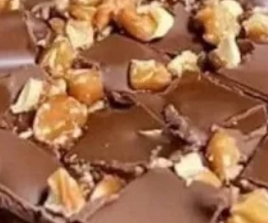 3. Top with chocolate: In a dish that can be microwaved, melt the semi-sweet chocolate chips by heating them for 30 seconds at a time while stirring until smooth. On top of the caramel layer, evenly distribute the melted chocolate. As a finishing touch, you may drizzle some white chocolate over the top.