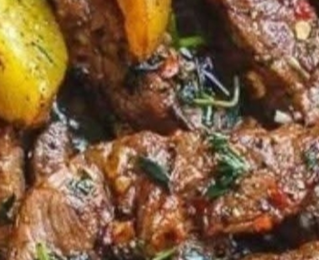 Steak of your choice (ribeye, sirloin, or filet), baby potatoes halved, olive oil, butter, minced garlic, fresh thyme or rosemary, salt, black pepper, and chopped parsley for garnish.
