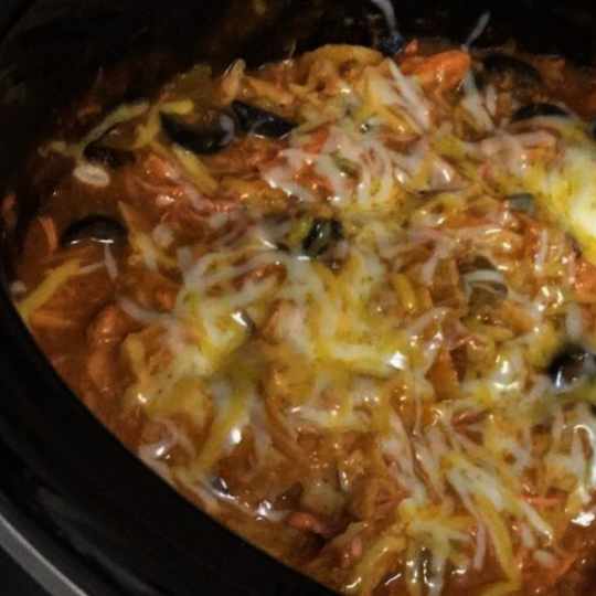 Then when I get home I shred the chicken stir in corn tortillas strips add some cheese and olives stir add a little more cheese and olives on top cook for one more hour and wow! Easy enchiladas and I don’t have the huge mess all over my kitchen from frying tortillas and rolling the enchiladas.