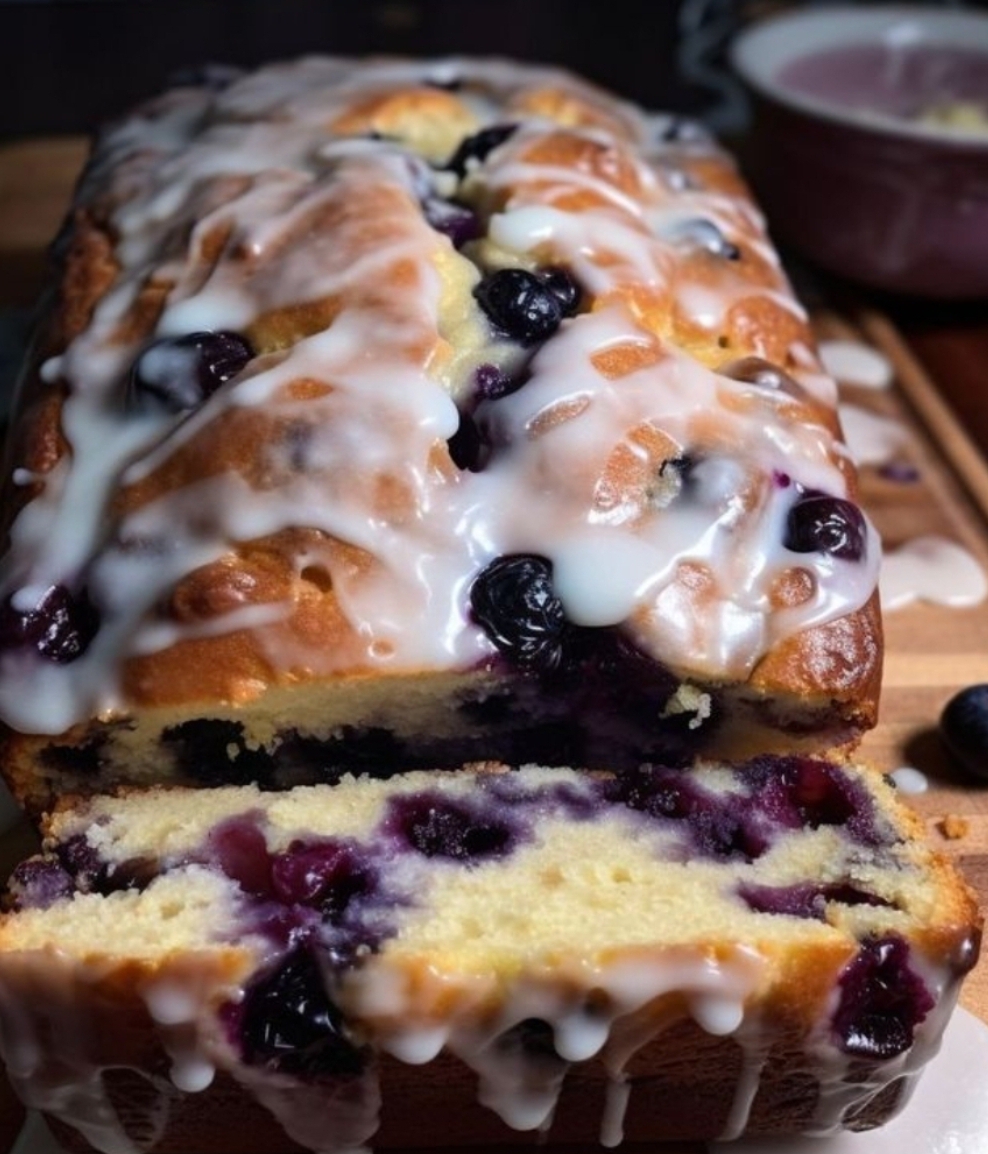 2. Drizzle the glaze over the cooled Lemon Blueberry Loaf, allowing it to drip down the sides.